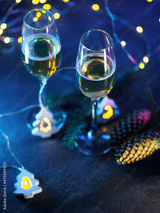 Two glasses of champagne, a Christmas composition. Blue background with a garland in the shape of a Christmas tree