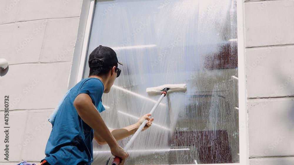 An employee of a professional cleaning service in overalls washes the glass of the windows of the facade of the building. Showcase cleaning for shops and businesses