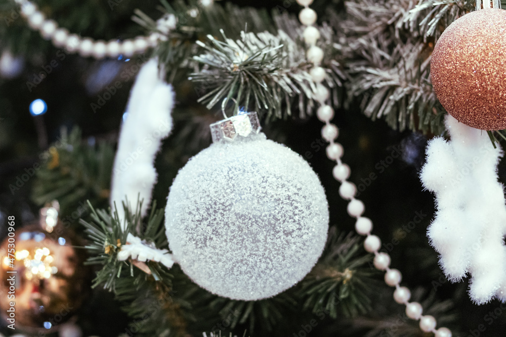 Gold and white christmas balls with sparkles on a snowy christmas tree close-up