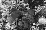 Red bow, christmas balls and garlands on a christmas tree close-up