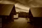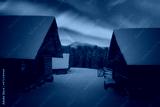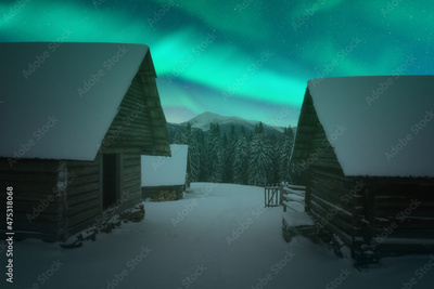 Fantastic winter landscape with wooden houses in snowy mountains and northen light in night sky. Christmas holiday and winter vacations concept