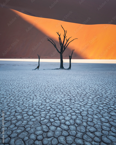 Dead Camelthorn Trees at sunrise, Deadvlei, Namib-Naukluft National Park, Namibia, Africa. Dried trees in Namib desert. Landscape photography