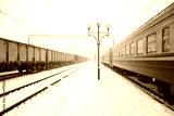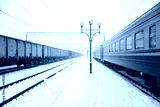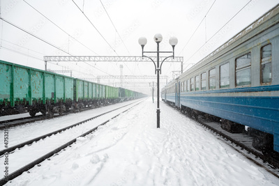 Train station peron covered by snow in winter time. Passenger train and freight wagons on snowy railways. Ukraine, Europe