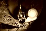 A glass of whiskey in old oak barrel. Copper alambic on background. Traditional alcohol distillery concept