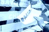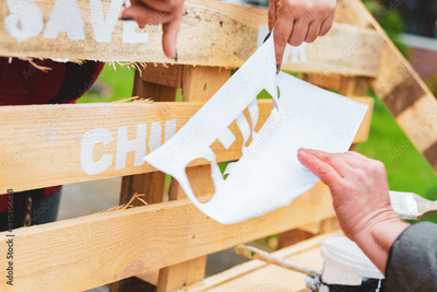 People make an inscription in white paint using a stencil