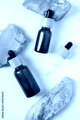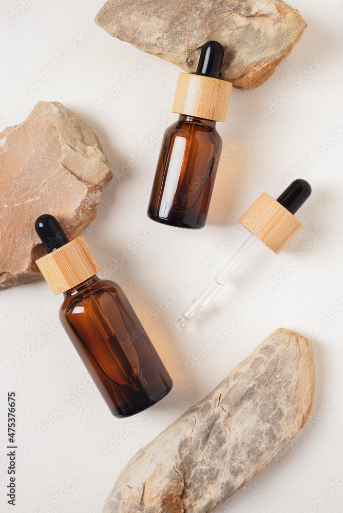 Amber glass dropper bottles with bamboo lid on stones. Skincare products, natural cosmetic. Beauty concept for face and body care.