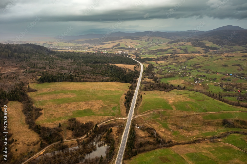 Aerial view of a narrow winding road through the beautiful wooded Carpathians, amazing spring landscape, outdoor tourist background, Transcarpathia, Ukraine