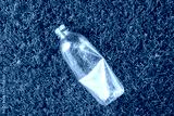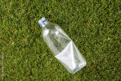 recycling, garbage disposal, environment and ecology concept - close up of empty used crashed plastic water bottle on grass