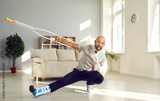Good thing I'm alive. Happy funny optimistic man with multiple physical injuries after car crash or domestic accident holding crutch and giving thumbs-up showing how he's enjoying sick leave at home