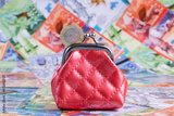 A coin in denomination of 100 Kazakhstani tenge and a miniature red wallet against the background of Kazakhstani banknotes