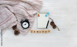 alarm clock, sweater, letter "january", notepad, pencil, pine cones on white wooden background. january month calendar concept. winter season. flat lay. copy space