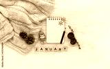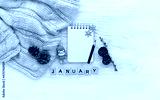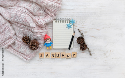 sweater, letter "january", notepad, pencil, doll toy , pine cones on white wooden background. january month calendar concept. winter season. flat lay. copy space