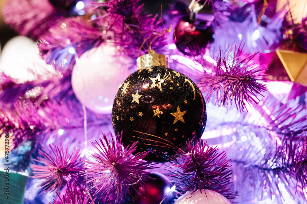 Christmas balls and glowing garlands on a purple christmas tree
