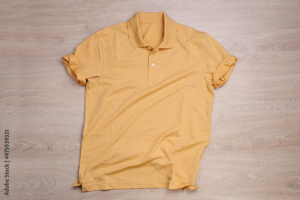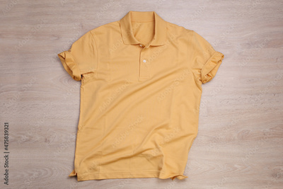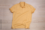 Roll up orange pastel polo shirt on wooden background