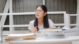 Asian student women reading books in library at university. Young undergraduate girl do homework, read textbook, study hard for knowledge and education on lecture desk at college campus.