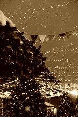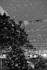 Christmas fair on Red square in Moscow. Festive winter season. Christmas decorations and glowing garlands on blurred background