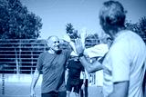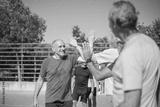 Energetic senior thanking each other after match. Men with grey hair in sport clothes standing in row on sport field, giving high fives. Football, sport, leisure concept