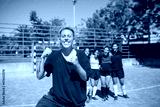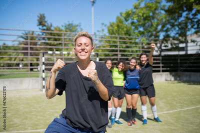 Portrait of playful young woman on football field. Sportswoman in dark uniform winking at camera, cheerful teammates in background. Sport, leisure, active lifestyle concept