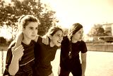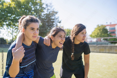 Young female friends on football field. Sportswomen in different uniforms looking at competitives, making faces. Sport, leisure, active lifestyle concept