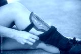 Close-up of tanned woman getting ready for football training. Female player sitting on grass, putting on socks over feet protection. Football, sport, leisure activities concept
