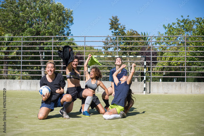 Ecstatic young women celebrating victory on football field. Sportswomen in uniforms screaming happily. Waving T-shirts in air. Sport, leisure, active lifestyle concept