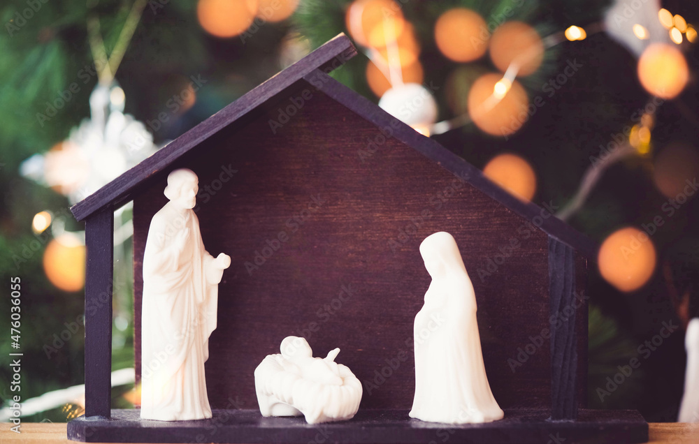 Christmas nativity scene of born child baby Jesus Christ in the manger with Joseph and Mary.Traditional Christmas advent Nativity Scene Jesus in the manger on bokeh background.christian nativity scene