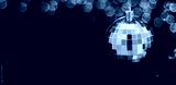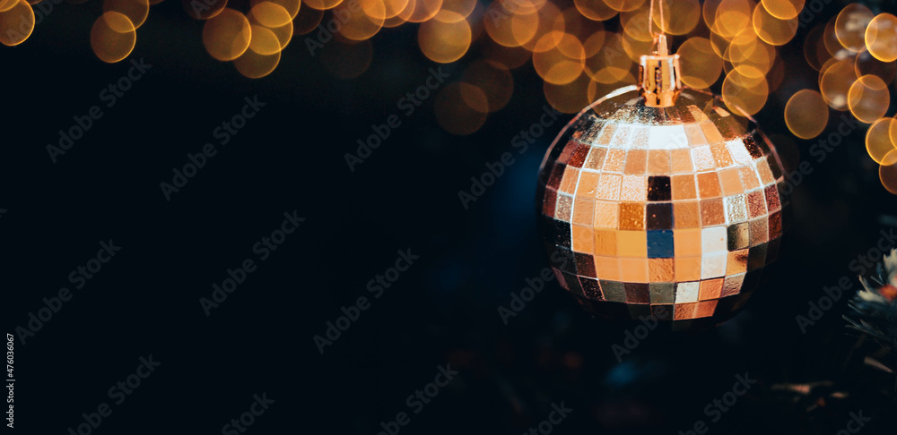 silver bauble disco ball hanging from a decorated Christmas tree.Christmas tree decoration background.Christmas celebrate winter season in holiday eve, Christmastime.silver gold bright and shiny green