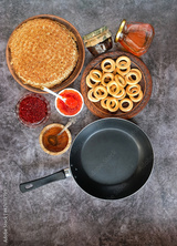 pancakes on plate, red caviar, jam, honey, frying pan on dark background. Maslenitsa holiday, pancakes week. traditional slavic festival meal. top view, copy space