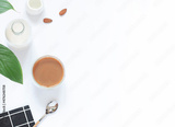 A Cup of coffee with organic almond milk on the white table. Top view. Copy space
