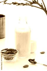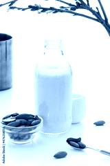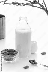 Almond milk in the glass bottle on the white table. Plant based dairy free vegan beverage