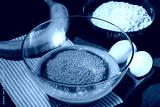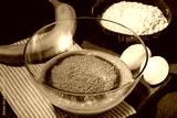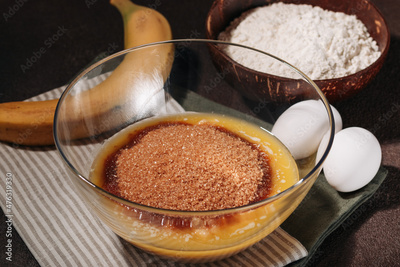 Mix of mashed banana, melted butter and cane sugar for cooking banana bread on brown background