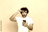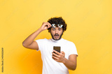 Amazed shocked unshaven Indian or Arabian guy holding smartphone in his hand, looking at the camera in surprise with his glasses raised, shocked facial expression, isolated orange background