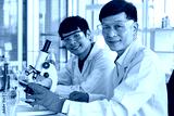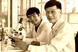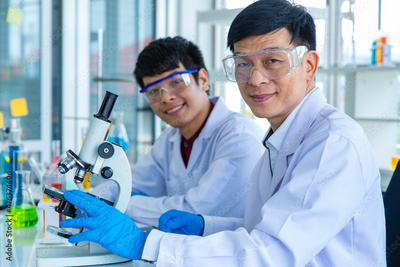 Portrait closeup shot of Asian mature male scientist teacher in white lab coat safety goggles and rubber gloves using microscope smiling look at camera with university student in blurred background