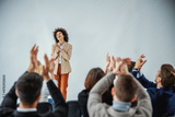 Multicultural group of business people cheering and clapping to a mixed race businesswoman who just finished her speech.