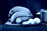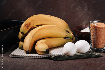 Ingredients for cooking banana bread on brown background
