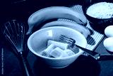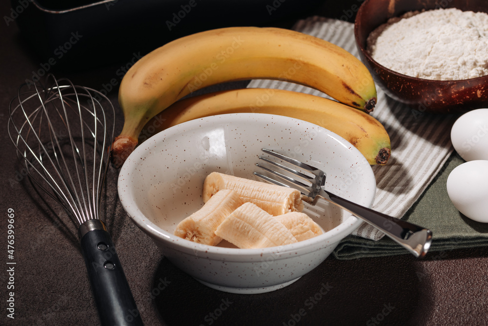 Peeled and broken bananas in ceramic bowl - ingredient for cooking banana bread on brown background