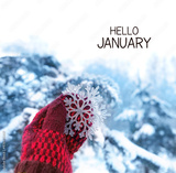Hello January. hand in mitten holding decorative snowflake, winter natural background. January month calendar concept. symbol of winter festive season