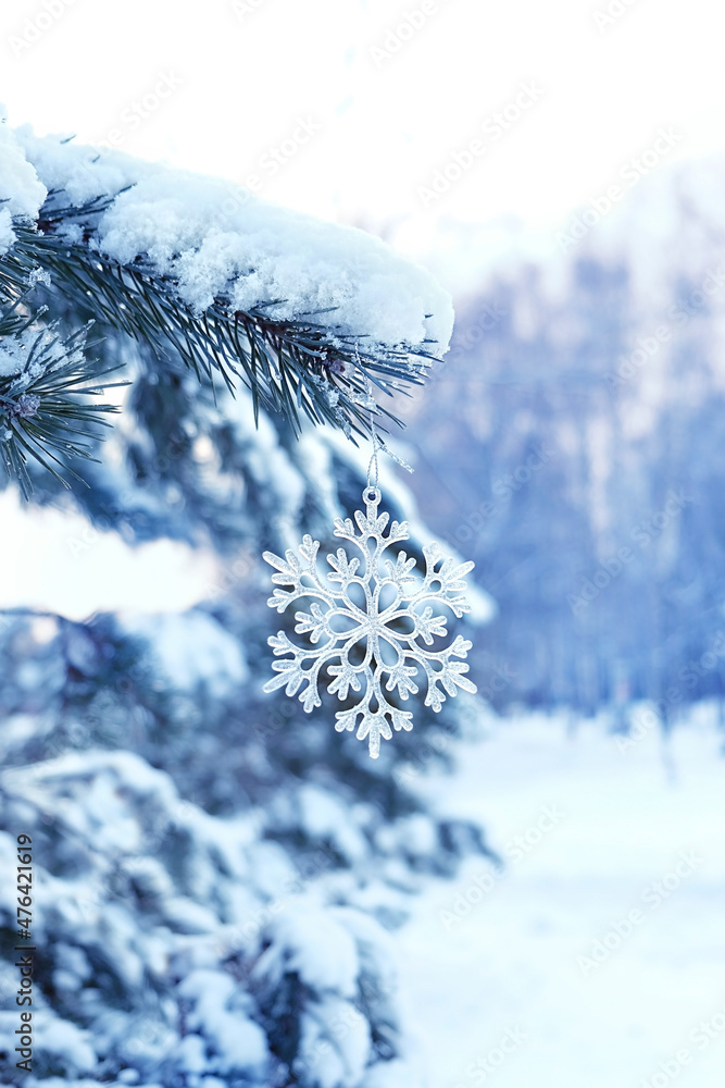 decorative snowflake on snowy pine tree, natural winter background. symbol of Christmas and New Year holidays. winter festive season concept