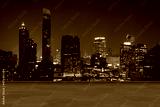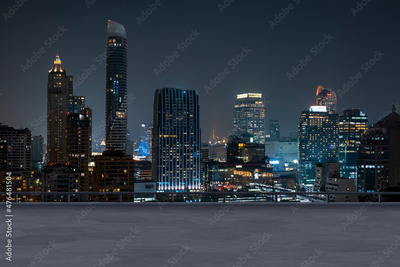 Panoramic Bangkok skyline view, concrete observatory deck on rooftop, night time. Asian corporate and residential lifestyle. Financial city downtown, real estate. Product display mockup empty roof