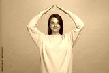 Life insurance. Positive young girl show house roof gesture overhead feeling herself in safety on yellow background