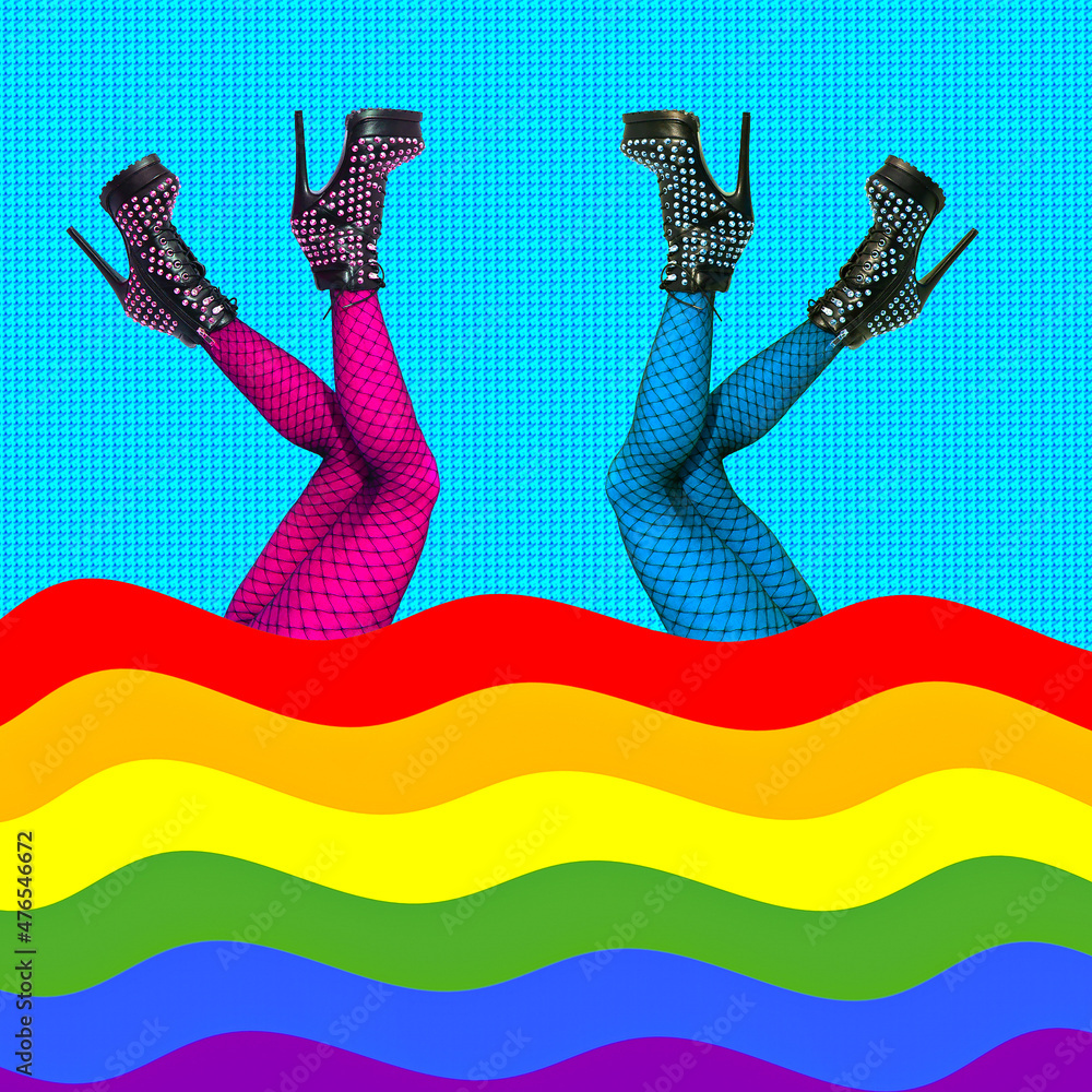 Contemporary digital collage art. girls Legs in Creative rainbow space. Fashion, party, pride, clubbing concept