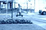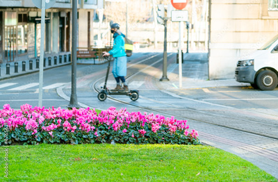 Pink flowers and green grass decor in the garden on the traffic island on blur a man riding electric scooter across railway of city tram. Modern transport in Europe. Electric vehicle. Green transport.