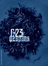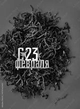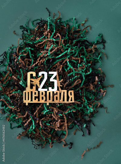 happy February 23 russian text and camouflage color shredded paper packaging material on dark green background. Greeting card for day of defenders of fatherland. 23 february holiday