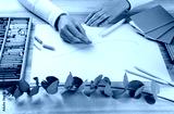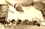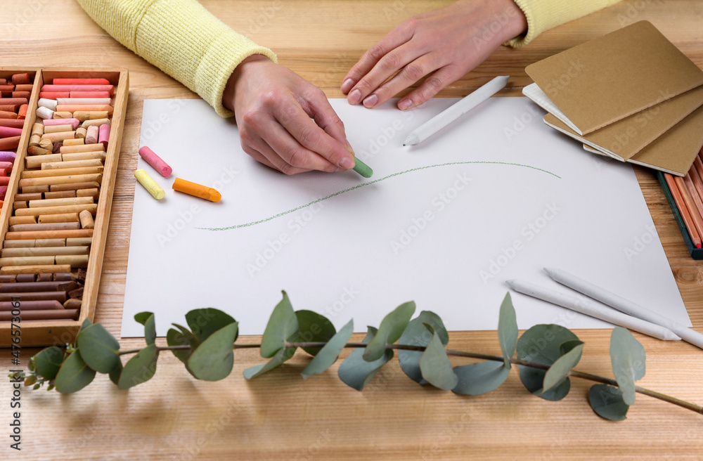 Woman drawing eucalyptus branch with soft pastels at wooden table, closeup