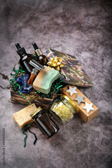 Gift set in box for men on dark grey background. zero waste gift with cosmetic organic care, eco friendly. idea Present for day of defenders of fatherland, Father's day. brutal stile