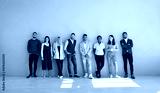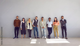 Diverse multiracial people employees stand near grey wall background, show teamwork. Multiethnic millennial colleagues coworkers group demonstrate unity and leadership. Collaboration concept.