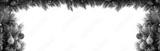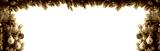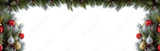 Christmas green pine branches with red, golden, silver balls, cones, red berries. Tips of pine twigs covered with snow. Pine twigs on top frame copy space. Isolated on white background. Banner size