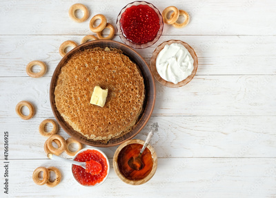 pancakes, red caviar, jam, honey, sour cream, bread bagels on white wooden table background. Maslenitsa holiday, pancakes week. traditional slavic festival meal. flat lay
