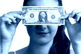 Beautiful teen girl shows one dollar in front of her eyes.