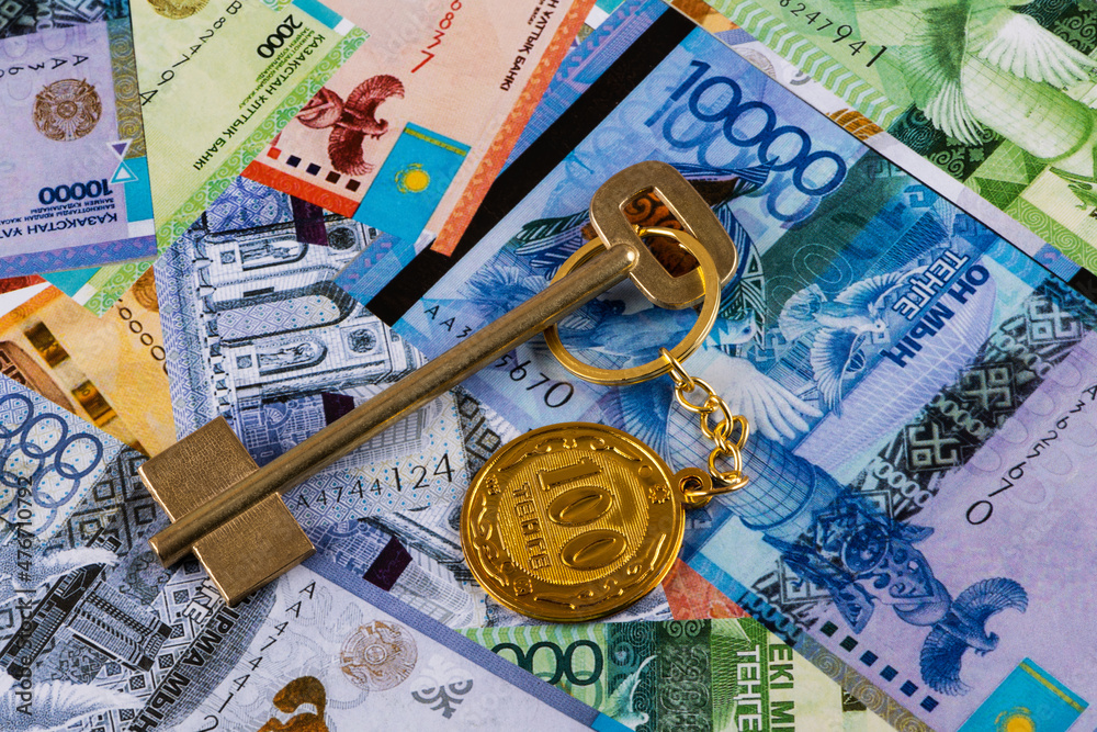 Golden key with a keychain in the form of a coin in denomination of 100 Kazakhstani tenge against the background of Kazakhstani banknotes